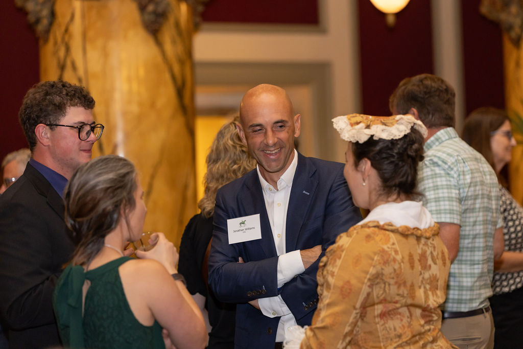 Guests included Virginia Johnson, co-author of Virginia Horse Racing: Triumphs of the Turf, Matt Lohr, Secretary of Agriculture and Forestry, and a special appearance by historical actors from St. John’s church portraying prominent Virginians President George Washington, Martha Washington, President Thomas Jefferson, and Governor Patrick Henry who all enjoyed mingling with the partygoers. Many connections to the horses running on Virginia Derby Day were in attendance along with representatives of the Commonwealth’s Legislature as well as the many supporters from all stakeholders who have been such a big part of Virginia’s successful horse industry. The food and ambiance represented all things Virginian with dogwood branches, magnolia leaves, ham biscuits, chicken with waffles (a southern favorite), fried green tomatoes, oysters, shrimp, and crab cakes.