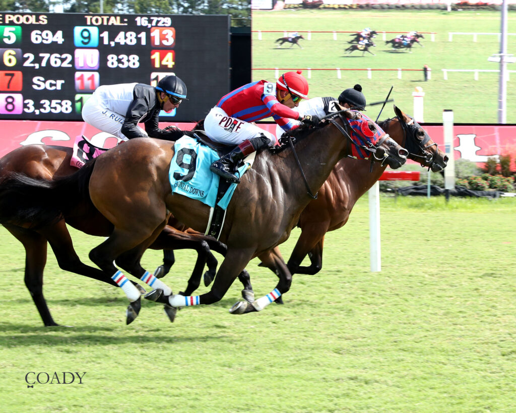 Hollywood Walk’s second straight Camptown title also came in dramatic fashion. Tracking leader Bosserati from mid-pack, she rallied up the rail in the stretch and put her head down just in time to hold off Chickahominy. Stablemate Noquestionaboutit finished third.